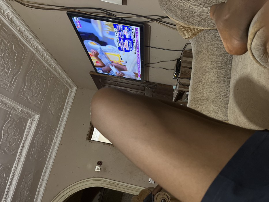 A person relaxes on a couch, leg and foot visible, while watching television. The TV displays religious programming with text overlaying the image. The text lists "GREAT POWER MINISTRY," "ANBUS STOP," and "CHEF'S PALACE." A message encourages viewers to "TOUCH WITH THE PROPHET ON 9th JANUARY 2026 AT KU." The room has decorative molding on the ceiling and walls, and visible wiring runs along the ceiling.