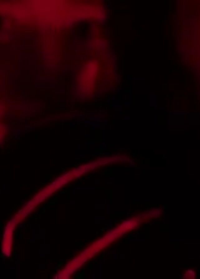 In a darkened setting with red lighting, a young individual with dark hair is visible from the chest up