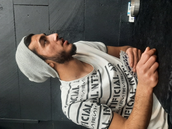 - "A man wearing a gray beanie and a white t-shirt with black "OFFICIAL FIRE" stripes is holding playing cards" by FM-J2D4h2, licensed under CC BY 4.0