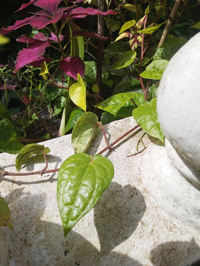 This image depicts a botanical arrangement in Mindat, Myanmar. The foreground prominently features a green-leafed vine with reddish-brown stems, characteristic of a betel plant (Piper betle), trailing across a light-grey, textured concrete surface. Strong sunlight illuminates the scene, casting distinct, dark shadows of the heart-shaped leaves onto this surface. To the right, a large, rounded, off-white object, consistent with a planter or garden ornament, is partially visible. The background consists of a dense cluster of various plants, including foliage with vibrant magenta-purple, serrated leaves (likely Coleus), interspersed with other smaller green and yellowish-green leaves and thin stems. No human figures are present; the scene focuses entirely on the plant life and its immediate surroundings.