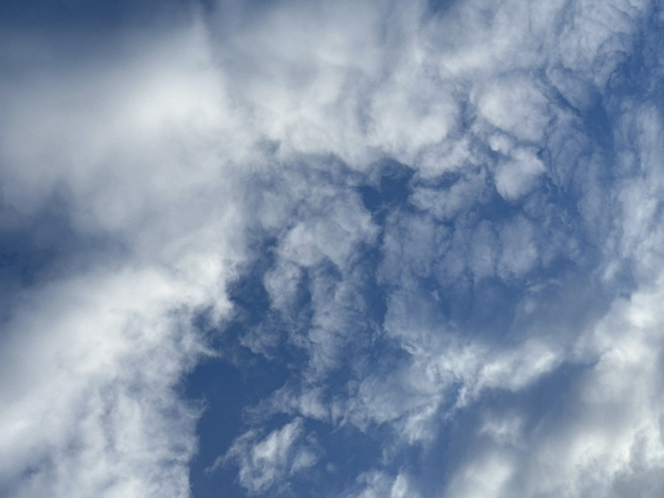 The image displays an expansive view of the daytime sky over Dupnitsa, Bulgaria. The environment consists exclusively of atmospheric phenomena. A deep blue sky is visible, particularly in the central and upper-left portions of the frame. This blue expanse is partially covered by a variety of cloud formations, predominantly in shades of white and light grey. Cloud structures range from diffuse, wispy filaments to more concentrated, opaque masses. No terrestrial features, anthropogenic structures, individuals, or discernible objects other than clouds are present within the captured scene. The lighting indicates daylight conditions with partial cloud cover.