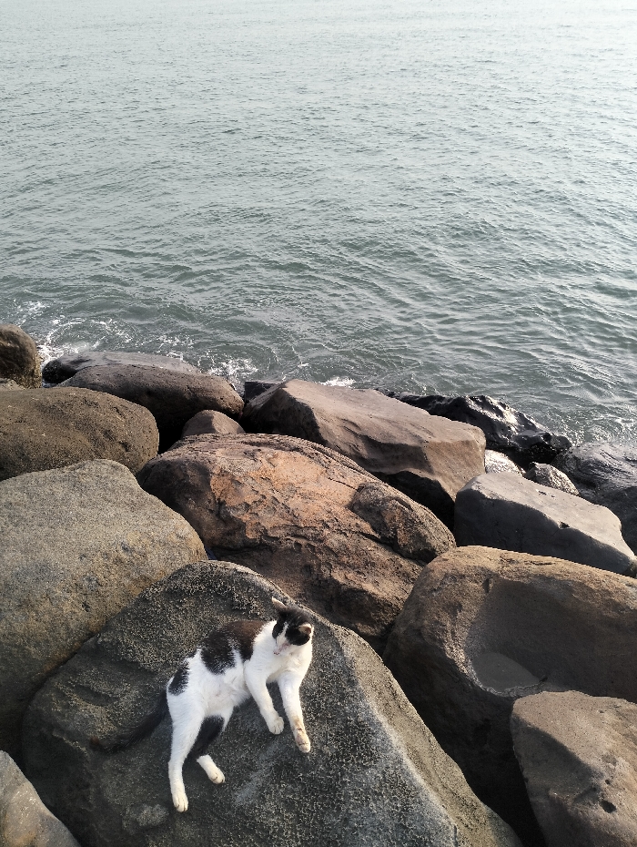 A black and white cat rests on a large, grey rock, one of many that line the water's edge. The ocean stretches out, its surface rippling gently under diffused sunlight. The rocks vary in size and texture, some appearing smoother and darker than others. The cat is positioned towards the bottom of the frame.