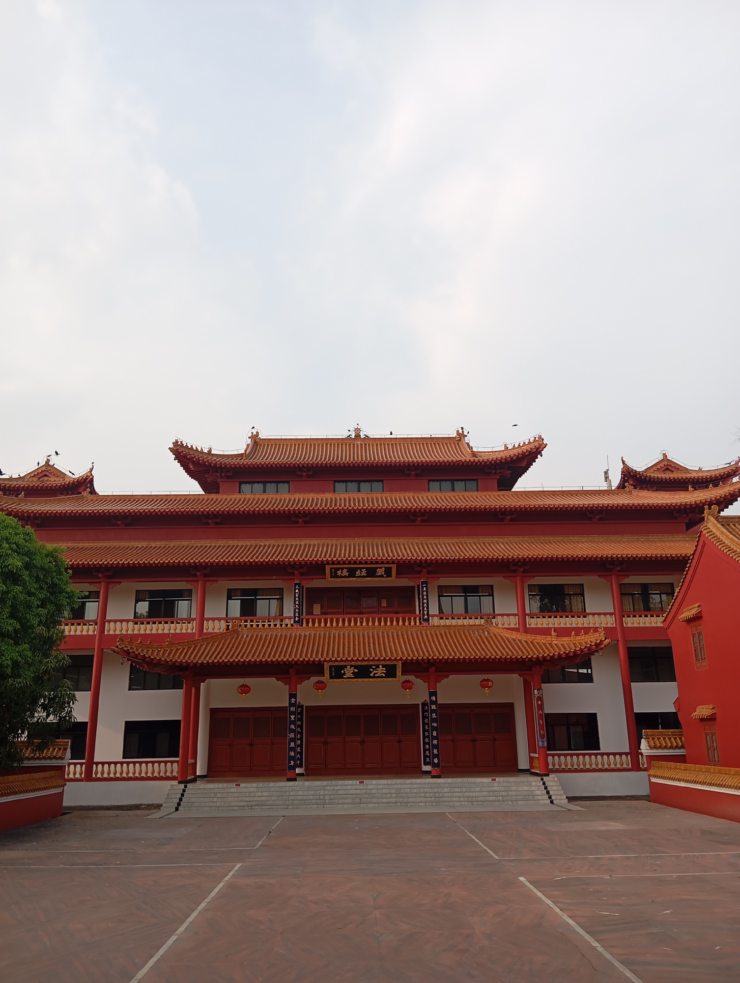 An exterior, frontal view depicts the Zhong Hua Chinese Buddhist Monastery in Lumbini Sanskritik, Nepal. The dominant subject is a multi-tiered building rendered in red and white, featuring traditional Chinese architectural elements including sweeping, golden-orange tiled roofs with ornamental ridge figures. The primary facade presents a grand entrance with a covered porch supported by red columns, accessing red double doors via a wide, grey staircase. Two horizontal plaques and vertical banners with Chinese characters are affixed to the facade. Two red lanterns hang under the lower porch roof. The upper level features a white balcony with red balustrades and multiple dark-paned windows. A smaller, red building with a similar roof style is partially visible to the right. The foreground consists of a large, reddish-brown paved courtyard with faint white markings. A dense green tree partially obstructs the left side of the building. The sky is uniformly light grey and overcast. No individuals or active events are present in the scene.