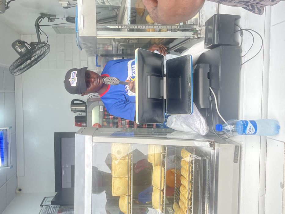 An indoor commercial setting in Badore, Nigeria, displays a food service counter