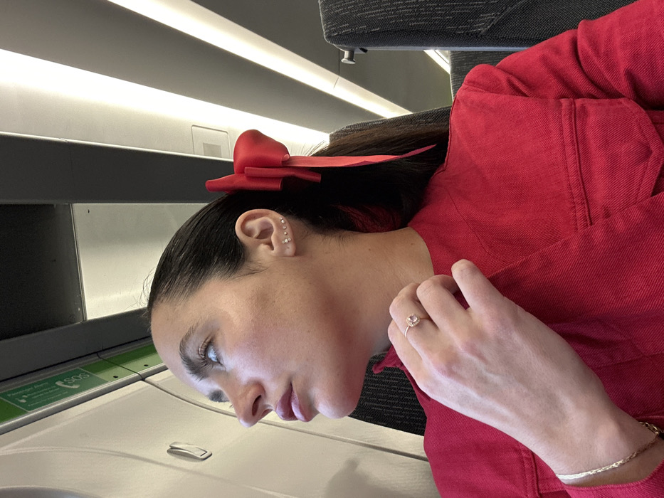 A female subject is depicted in a close-up, profile view, positioned within a modern train carriage. She has dark hair, styled into a ponytail secured with a prominent red bow. Her visible right earlobe displays three small, light-colored stud earrings. She wears a bright red garment, consistent with a jacket or blouse, featuring a visible pocket flap on the right chest area. Her left hand, adorned with a ring featuring a light-colored oval stone on the ring finger and a thin, gold-colored bracelet on the wrist, is raised to her neck/collar, gently touching the fabric. Her head is tilted slightly upwards, and her gaze is directed towards the upper left of the frame. The background reveals typical train interior elements: a window frame with a green "SOS" sign on the left, white strip lighting integrated into dark grey ceiling panels, and a dark grey, patterned seatback partially visible on the right. No specific landmarks or external features are visible to pinpoint a precise location within the city of Bath, United Kingdom; the scene is identifiable only as an interior of a train carriage.
