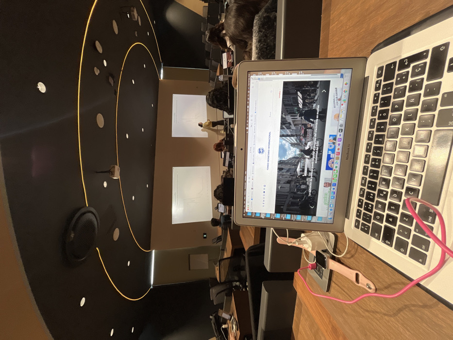 The image depicts an indoor lecture hall or conference room located in Fraccionamiento Los Heroes Queretaro, Mexico. In the immediate foreground, a silver Apple MacBook Air laptop is open on a wooden desk. Its screen displays a web browser showing the "FONDO MONETARIO INTERNACIONAL" (International Monetary Fund) website, with an article headline visible and a street scene image. A pink charging cable is connected to the laptop. To the left of the laptop, on the same wooden surface, a black Apple Watch with a pink band is connected to a white magnetic charging puck, which is also linked to the pink cable via a white USB power adapter block. The laptop features a Spanish QWERTY keyboard layout. Beyond the foreground, several individuals are seated in tiered rows of dark upholstered chairs with integrated wooden tabletops, facing the front of the room. Many of these attendees have open laptops on their desks. At the front of the hall, between two large projection screens displaying graphs or charts, a single individual, dressed in a yellow top and dark pants, stands facing the audience, appearing to present. The room's ceiling is black, featuring multiple recessed circular lights and a prominent curved orange/yellow LED strip light. A large circular ceiling vent or speaker and a ceiling-mounted projector are also visible. The walls are a mix of light and dark surfaces.