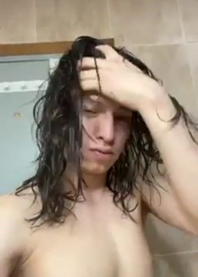 A topless young man with long, wet, dark hair is standing in a bathroom with tiled walls. He is looking at the camera while running his hands through his hair, shaking it back, and styling it. The bathroom appears to be lit by an overhead light, and a door is visible in the background. Faint music can be heard.