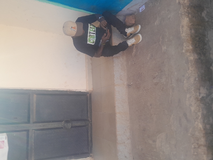 An adult male is seated on a concrete step in an outdoor or semi-outdoor setting in Rafin Bauna, Nigeria
