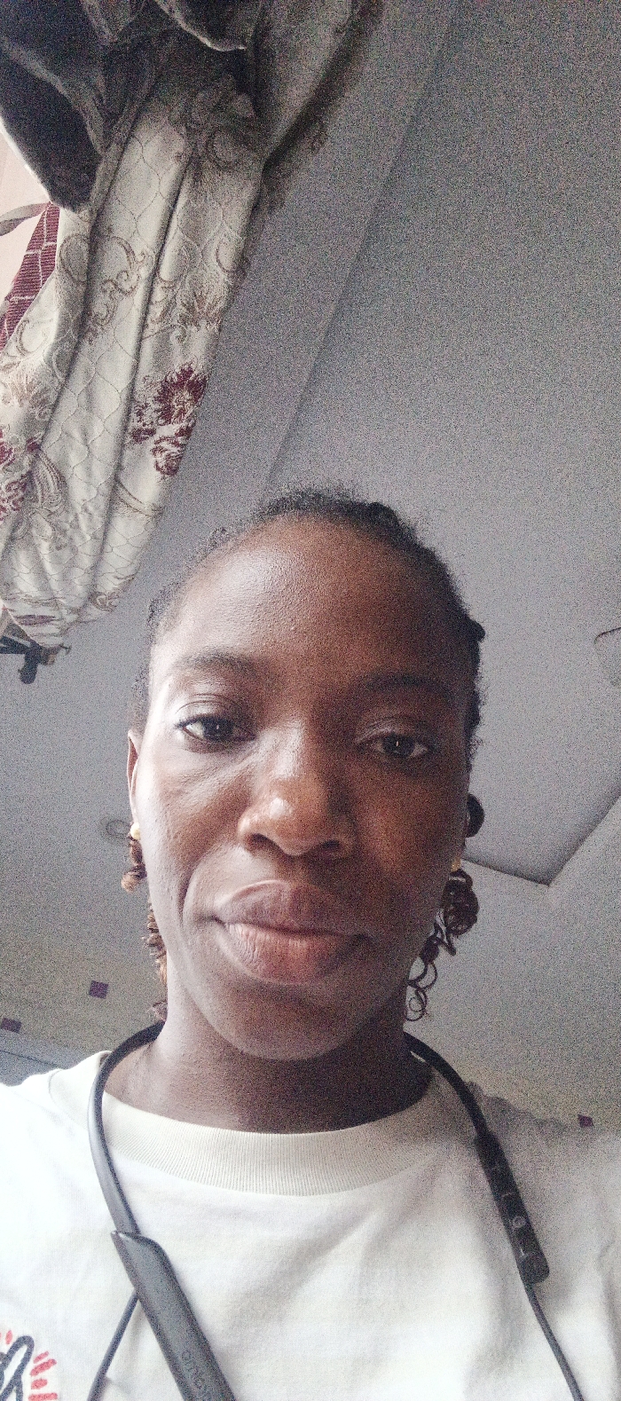 close-up portrait of a young Black woman, with curly black hair, wearing a white t-shirt, and a black neckband. The woman is looking directly at the camera with a neutral expression. The background is a plain white ceiling, with a portion of a patterned curtain in the upper left corner. There are visible light fixtures in the ceiling. The image is taken from a low angle. The coordinates (latitude: 5.029, longitude: 7.935) indicate the image was taken in Uyo, Nigeria, although the specific location within the city cannot be determined from the image alone.