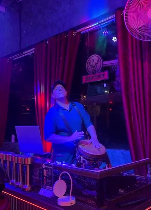 A man is playing a bongo at a bar in the evening. He is wearing a blue shirt with suspenders, a baseball cap, and a casual expression on his face. He stands behind a DJ booth that has an Acer laptop, a microphone stand, a drink menu, and LED lights. The bar is decorated with red curtains, a Jagermeister sign, disco balls, and pink fans. The lighting is colorful and creates a party atmosphere. The video pans to show the rest of the bar, with empty tables and chairs.