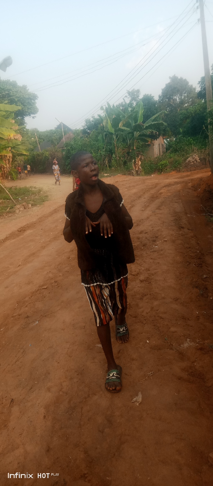 On a dirt road in a rural area, a child in striped shorts, a dark top, and a brown vest is captured mid-motion. They appear to be calling out or speaking to someone, with their mouth open and hands raised. The environment includes dense vegetation, banana trees, and glimpses of local dwellings. Other people can be seen in the background along the road. The sky is bright but hazy, and overhead power lines are visible. The photograph seems to capture a moment in the daily life of the community.
