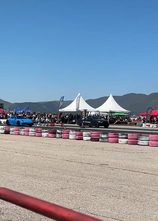 two cars racing on a track. On the left side is a blue sports car, and on the right side is a dark-colored vehicle. As the race starts, the black vehicle accelerates faster and quickly surpasses the blue sports car. The track is lined with tires that are painted pink, white, and red. There is a large crowd of people gathered in the background, watching the race from under several tents. In the far background, mountains can be seen under a clear blue sky.