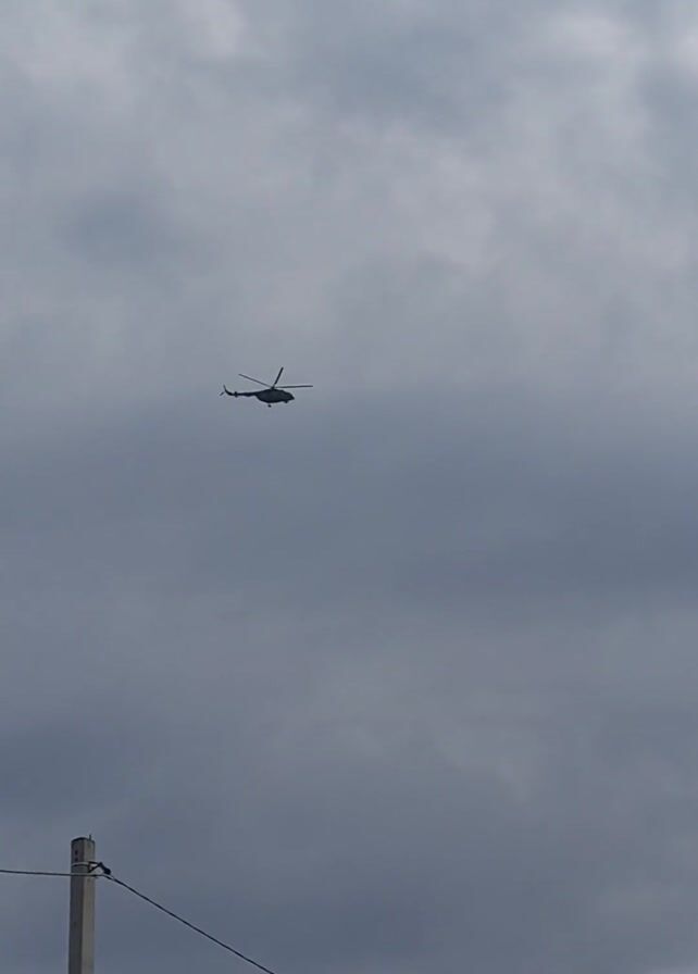 helicopter flying in a cloudy sky. The helicopter appears dark against the overcast background. A power pole is visible in the lower left corner of the frame. As the video progresses, the helicopter gets closer, revealing its rotor blades and tail rotor. The helicopter is flying level.