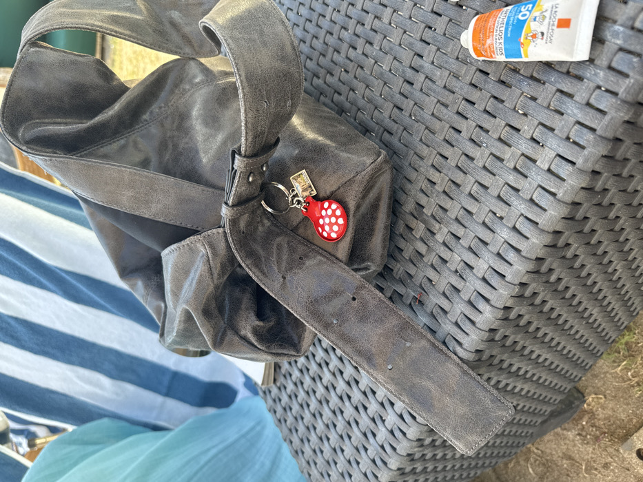 A gray leather shoulder bag sits on a woven patio chair. The bag features a thick strap with a silver buckle and a red mushroom-shaped keychain. A tube of sunscreen rests on the chair next to the bag. Part of a blue and white striped cloth and light blue fabric are visible in the lower left corner. The chair is dark gray with a woven texture.