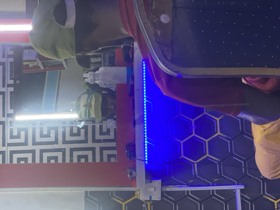 An indoor scene in Jos, Nigeria, depicts a person seated facing a mirror, likely within a barbershop or salon. The individual, seen from behind, wears a red short-sleeved shirt and light orange trousers, occupying a dark blue chair with visible gold trim. White wired earbuds are worn. Their reflection in the prominent rectangular mirror, framed partly in red, shows the upper portion of their head, adorned with a green and white cap featuring a circular emblem. The wall behind the mirror displays a black and white geometric pattern. A vertical white LED strip light is affixed to the mirror's surface, reflecting brightly. Below the mirror, a white shelf holds a white spray bottle containing a blue liquid, and other small electronic devices, possibly grooming tools. A white electrical outlet is mounted on the wall to the left of the shelf. Below the shelf, a horizontal strip of blue LED lights illuminates a wall section covered in dark hexagonal tiles with gold outlines. The wall to the far left also features a hexagonal pattern in a different color scheme.