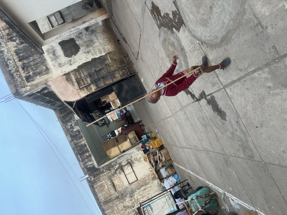 A child dressed in a red sweater holds a long stick, balancing it across their head. They stand in what appears to be an alleyway or courtyard. Buildings with weathered walls surround the area. Boxes, carts, and other miscellaneous items are scattered around the scene. The background is a mix of structures with windows and openings, under an overcast sky.