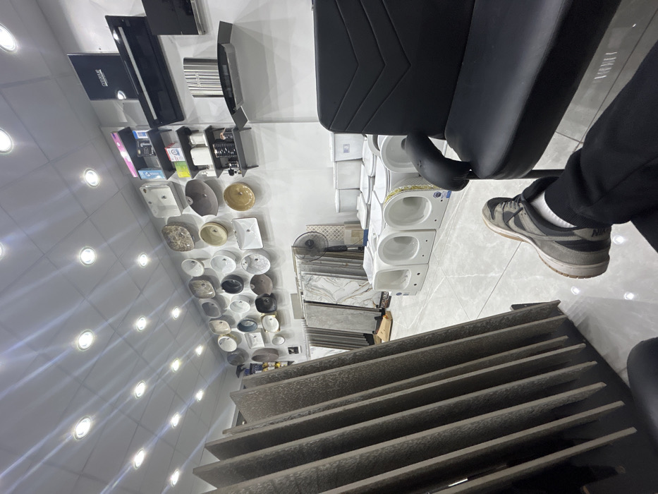 This image captures the interior of a retail showroom in Al-Yarmuk, Syria, specializing in bathroom and kitchen fixtures