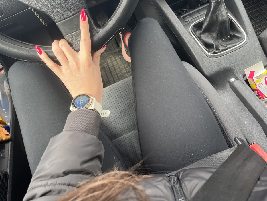 The scene depicts the interior of a vehicle, viewed from an overhead perspective, focusing on the driver's area. A person is seated in the driver's seat, wearing a black puffer jacket and black leggings. A black seatbelt is fastened across the person's torso and lap. The left wrist displays a white Garmin smartwatch with a gold-toned bezel, indicating the time 12:17. Both hands, featuring red-painted fingernails, are positioned on a black three-spoke steering wheel. A foot, partially visible in a black shoe with a red accent, rests near the pedals. The car's interior includes dark grey fabric seats, a manual gear shifter with a black boot, and a handbrake lever. A small, partially open pink and white package is visible in a console compartment. A black rubber floor mat is present in the driver's footwell. The specified location in Meshtitsa, Bulgaria, is not visually verifiable from the image.