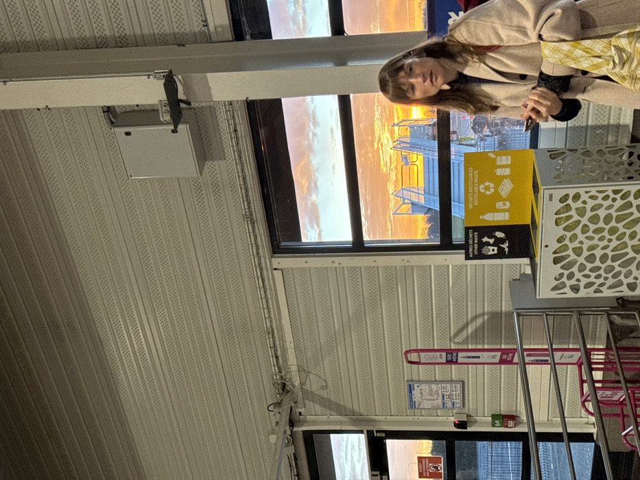The scene depicts an indoor area, likely within an airport terminal or transportation hub in Tillé, France, overlooking an outdoor vista at sunset. The interior features a light-colored, perforated ceiling and horizontally ribbed wall panels. Exposed metal wiring runs along the top of the wall. A white electrical box is mounted on a vertical support beam on the right. Large, dark-framed windows dominate the right side of the frame, revealing an outdoor scene. In the foreground, a multi-compartment recycling station is visible. Its base is white with an irregular perforated pattern. The top section consists of a black compartment labeled "AUTRES DÉCHETS" (Other Waste) with icons for general refuse and a yellow compartment labeled "DÉCHETS RECYCLABLES" (Recyclable Waste) with icons for bottles, paper, and the universal recycling symbol. To the left, a metal railing and part of a pink tubular structure, possibly a bike rack or information stand, are present. A red sign on a glass door on the far left reads "INTERDIT AUX PERSONNES NON-AUTORISÉES" (Forbidden to unauthorized persons). Adjacent to it, a blue and white sign displays "INFORMATION VOYAGEURS" (Passenger Information), and a pink vertical sign points towards a "SALLE D'ATTENTE" (Waiting Room). Through the windows, a vibrant sunset illuminates the sky with strong orange and yellow hues, complemented by scattered clouds. Below the horizon, a portion of a blue or metallic outdoor staircase or structure is visible, along with distant dark trees and what appears to be a paved area. An adult female, positioned in the lower right quarter of the image, is the sole individual present. She has shoulder-length brown hair with bangs and is wearing a light-colored (beige or tan) long coat over dark clothing. She holds a dark-colored smartphone horizontally in both hands around waist level and also grips a yellow and white plaid or striped fabric item in her left hand. Her gaze is directed slightly to the right of the camera's perspective. The lighting is a mix of indoor artificial light and the warm glow from the setting sun.