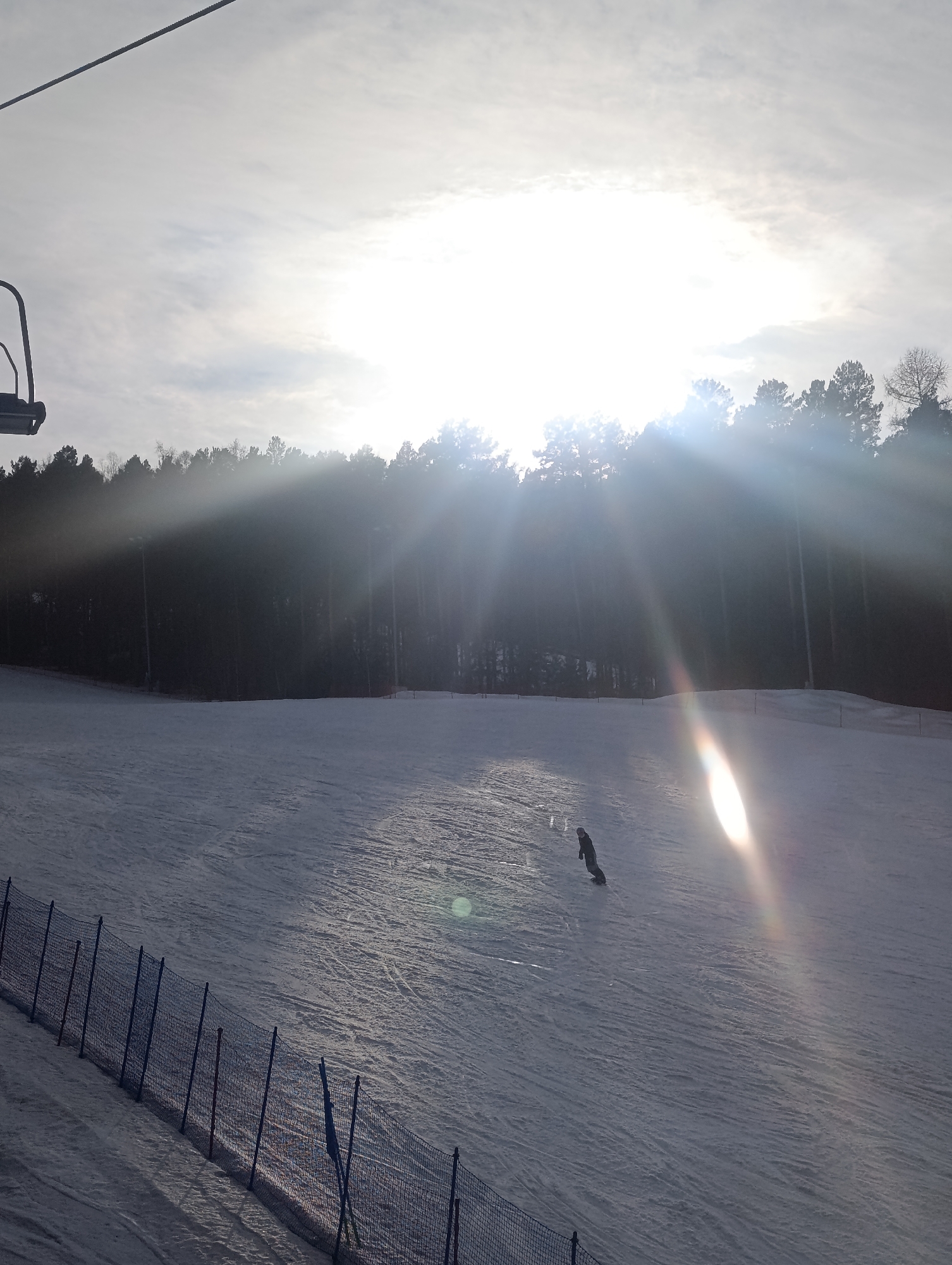 The image depicts a snow-covered ski slope, presumably at a resort such as Bobrovy Log Fun Park in Krasnoyarsk, Russia. The viewpoint is from a chairlift, with a portion of its seat and cable visible in the upper left. A dark, dense coniferous forest line defines the horizon across the upper middle, with some bare deciduous trees interspersed. The sky is partly cloudy, dominated by an intensely bright sun in the upper center, producing significant lens flares that radiate across the frame, obscuring details. A single individual, dressed in dark winter clothing, is actively descending the slope on a snowboard in the mid-right. The groomed snow surface displays visible tracks. A dark mesh safety fence, supported by vertical posts, angles across the lower left foreground, casting elongated shadows on the snow.