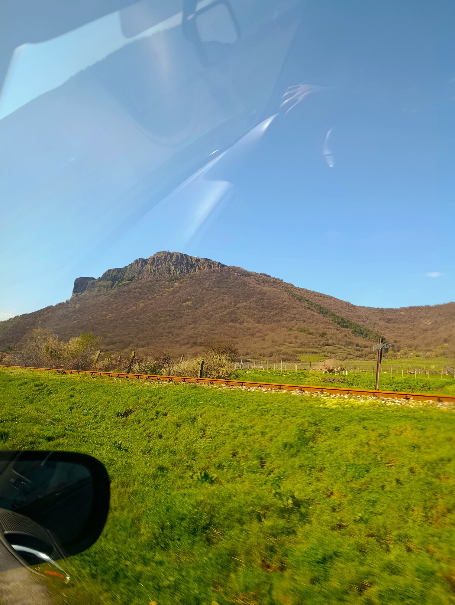 The image, taken from inside a vehicle, shows a landscape near Shiroko Pole, Bulgaria. In the foreground, vibrant green grass stretches towards rusty railroad tracks. A mountain dominates the background, its lower slopes covered with leafless trees, transitioning to rocky terrain near its summit. The sky is a clear blue. Reflections on the vehicle's glass are visible in the upper part of the image. A car's side mirror is visible in the lower left corner.