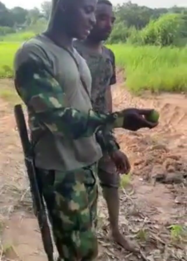 Two men are walking alongside a muddy ditch or trench. One man wears camouflage pants, a long-sleeved camouflage shirt, and black boots, and holds a green fruit-like object in his hand. The second man wears dark-colored pants and a dark shirt that appears wet and stained with mud, and is barefoot. He carries a black cell phone. The surrounding environment consists of tall green grass, trees, and dense foliage.