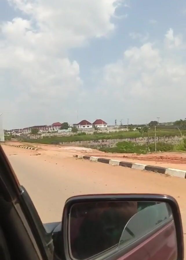 view from inside a moving car, looking out the driver's side window. The car is driving on a wide, paved road that appears to be lined with dirt or sand on the shoulders. The road has a black and white painted curb on the side closer to the camera. In the distance, there is a row of buildings that appear to be houses, with red roofs and white walls. There are also several tall, white poles that are presumably flagpoles lining the road. The sky is blue with white clouds. The side mirror of the car is visible in the lower left corner of the frame, reflecting an indistinct image of the interior of the car. The overall tone of the video is calm and uneventful, showing a drive on a sunny day.