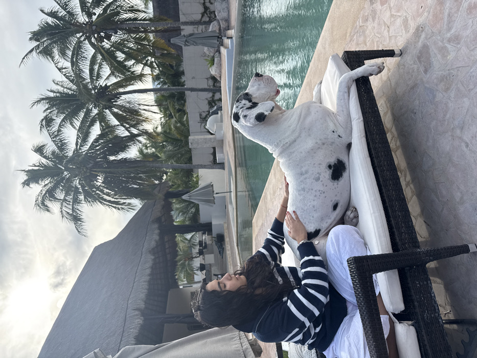 A person in a striped shirt pets a large, spotted dog lounging on a cushioned wicker couch. A pool runs alongside the couch. Palm trees and a building with a thatched roof are visible in the background. The image is taken during the day and is slightly rotated clockwise.