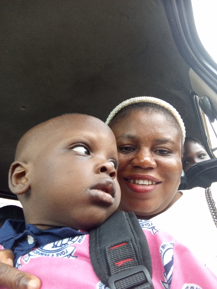 A close-up photograph depicts three individuals inside a vehicle in Lagos, Nigeria. The primary subject is an adult female with dark skin, positioned on the right side of the frame, smiling directly at the camera. She wears a white top, red lipstick, and a white beaded headband. To her left, in the foreground, is a young child with dark skin and a bald head. The child wears a pink shirt with a blue collar, featuring white graphics including the partially visible, inverted text "LOVE & SERVICE." A black strap, likely from a car seat or carrier, crosses the child's chest. The child's gaze is directed upwards and to the right, away from the camera, with a slightly open mouth. Partially visible behind the adult female's right shoulder is a third individual, showing one eye and a portion of their face, looking towards the camera. The vehicle's interior features a dark, textured headliner and a light-colored window or door frame visible on the far right.