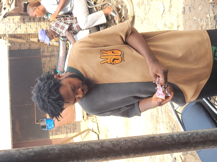 The image depicts an outdoor urban environment in Awka, Nigeria. In the foreground, a man with dark dreadlocks and a beard stands, looking down at crumpled Nigerian Naira banknotes, including a pink 100 Naira note, held in his hands. He wears a short-sleeved, loose-fitting shirt that is dark grey on the left side and light brown on the right, featuring a stylized hand emblem and "AUTHTHOROFF" text. A vertical metal pole is positioned to his immediate left. In the mid-ground, to the right, a man wearing a blue cap and a plaid shirt is seated on a dark motorcycle, with a woman passenger, distinguished by braided hair and a light grey t-shirt and pants, positioned behind him. The background includes an unpaved ground surface, reddish-brown brick walls, corrugated metal sheeting, and a partially visible sign with green lettering, reading "ACAMA" or similar. A blue plastic basket rests on a surface in the left background.