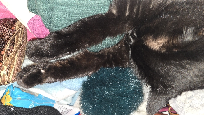 The image displays a black cat resting on a textured, dark green fabric within a domestic setting in Lompoc, United States. The cat's left side, including its head, back, and forelegs, is visible. The fur is primarily black, with light brown undertones evident on the neck and around the visible left ear. Its front paws are extended. Surrounding the cat are various textile items, including a fluffy, dark green pom-pom-like object near its head, and layers of light blue, white, and pink fabrics underneath. To the right, a brown and gold-toned object with a sequined, leopard-print pattern, possibly a bag, is present. In the upper right background, a crumpled blue plastic bag with yellow graphical elements is discernible. No human subjects are visible.