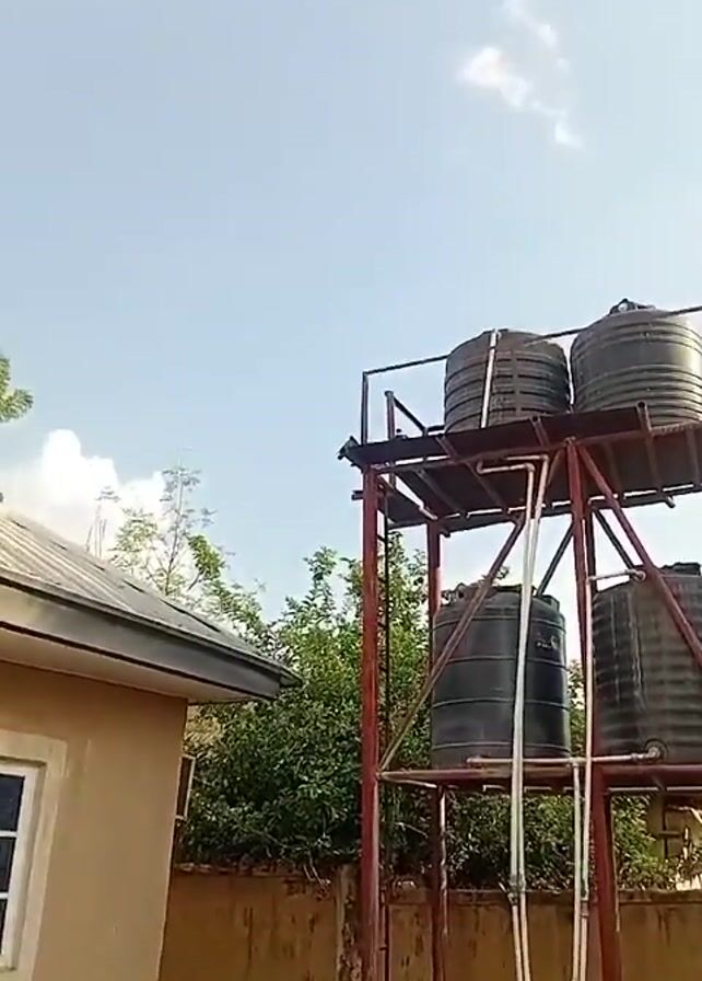 residential scene with a water tower in the background. The water tower is constructed of red painted steel and has two levels, each supporting two large black water tanks. A white ladder is affixed to the structure. Adjacent to the water tower is a single-story building with a tan exterior and a visible window. The ground is mostly concrete, with some scattered dirt and debris. A low wall borders the area. Above, the sky is blue with scattered clouds. A tall tree is visible between the building and the water tower, partially obscuring the view. The camera pans slightly upward and to the right, revealing the building's roof and a tree.