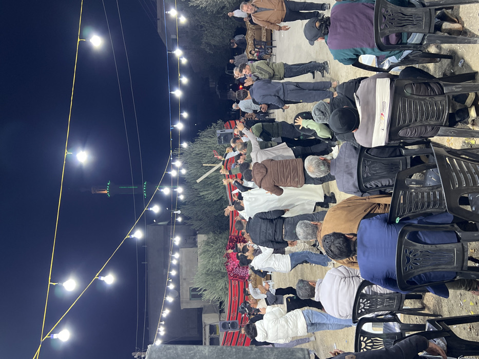 A large group of men are gathered outside at night, some standing, some kneeling, and some sitting on black plastic chairs. They appear to be observing a religious event, with one man holding what appears to be a religious item above his head. Strings of lights are strung overhead, and in the background, a minaret is visible. The atmosphere is solemn, and the lighting is dim.