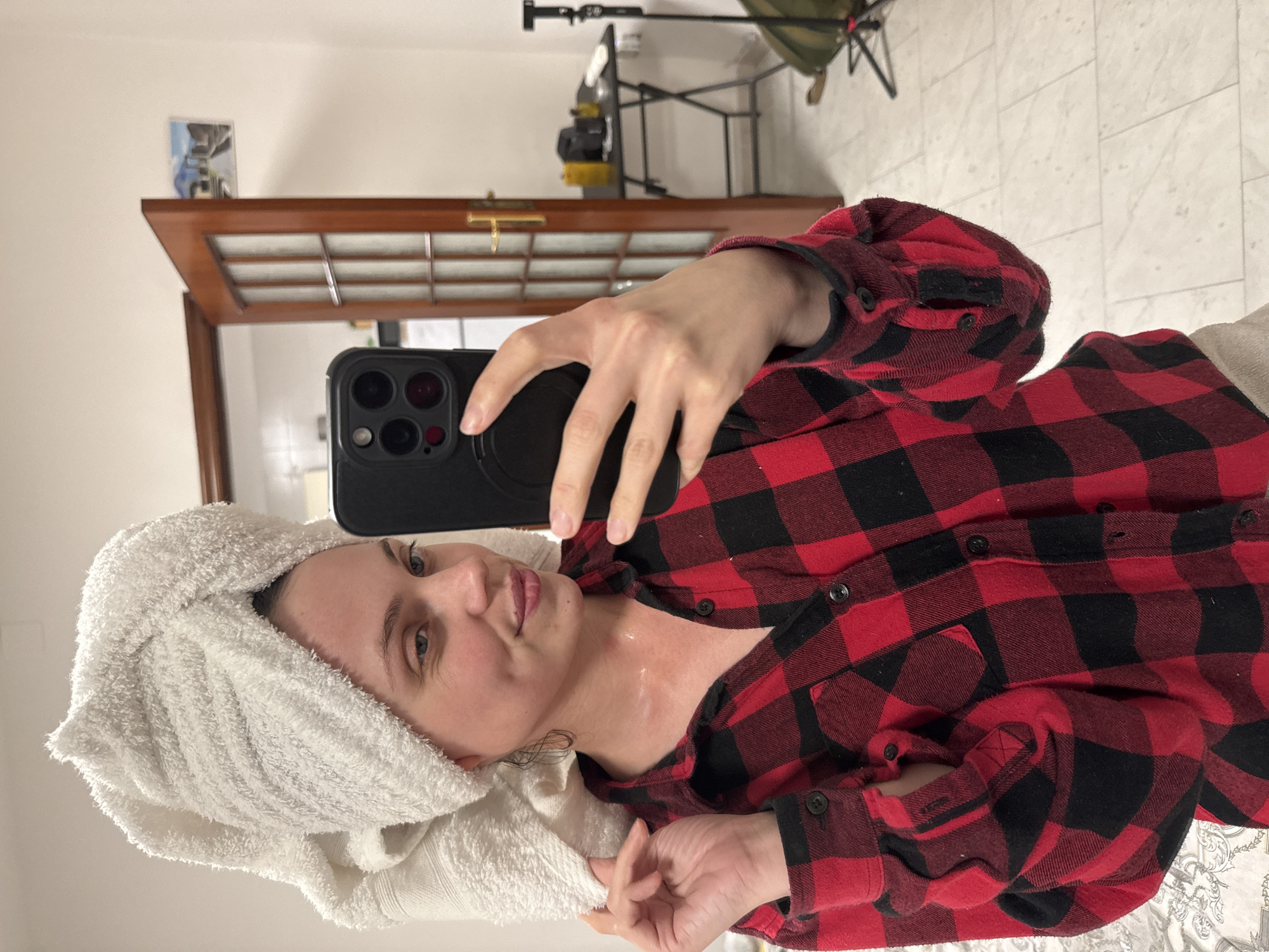 A Caucasian female subject is depicted in a mirror selfie taken indoors in Ercolano, Italy. She is positioned centrally, holding a black smartphone with her left hand to capture the image. Her hair is wrapped in a white terry cloth towel turban. She wears a red and black buffalo plaid long-sleeved button-up shirt. Her right hand is raised, lightly touching the towel on her head. Her expression shows a slight smile with lips lightly parted. Redness is visible on her neck. The background reveals a light-colored wall and a partially open brown wooden door with multiple glass panes. A small rectangular image, possibly a postcard, depicting ancient ruins, is affixed to the wall above the door frame. Behind the open door, a black folding table is visible, holding two yellow containers, a black bag or case, and other indistinct items. To the right of the table, a black stand, possibly a tripod or light stand, is present. The floor consists of light-colored square tiles. A patterned fabric, possibly a duvet cover, is visible in the lower-left foreground.