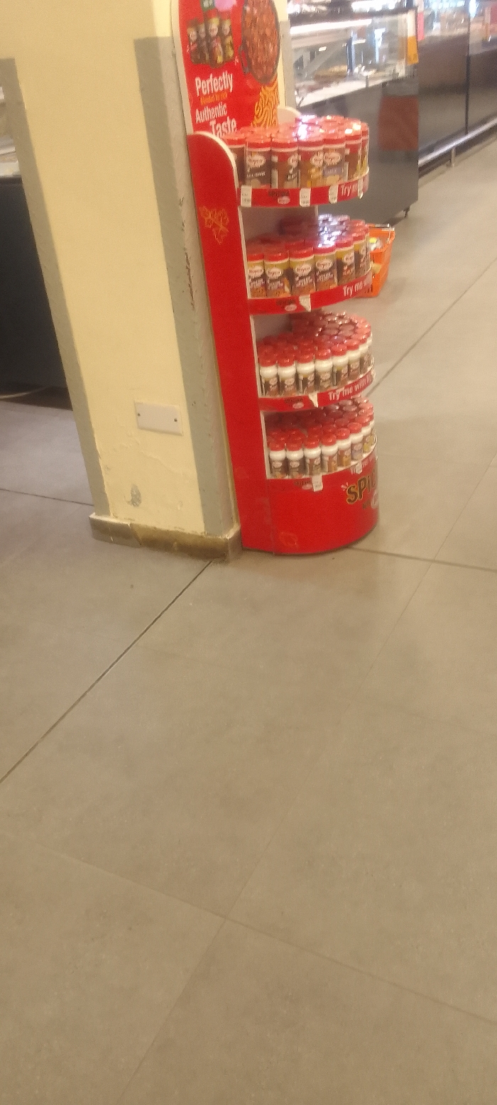 This image captures a static indoor scene within a retail establishment located in Viwandani ward, Kenya. The foreground features a light grey tiled floor with visible grout lines. To the left, a beige-painted structural pillar, approximately one-third of the image width, exhibits a grey base molding and a white, rectangular electrical outlet cover mounted on its surface. Adjacent to the pillar and occupying the central-right portion of the frame is a red, multi-tiered, point-of-sale display stand. This stand is fully stocked with numerous small, cylindrical spice jars, primarily white with red caps, branded "Royco." Visible product names include "Black Pepper" and "Garlic." The top section of the display features promotional text such as "Perfectly Authentic Taste" and graphic images of prepared food. In the blurred background to the right, elements of what appears to be a commercial refrigerated display case or counter are discernible, along with a partially visible orange object, possibly a basket. No individuals or active interactions are present in the scene.