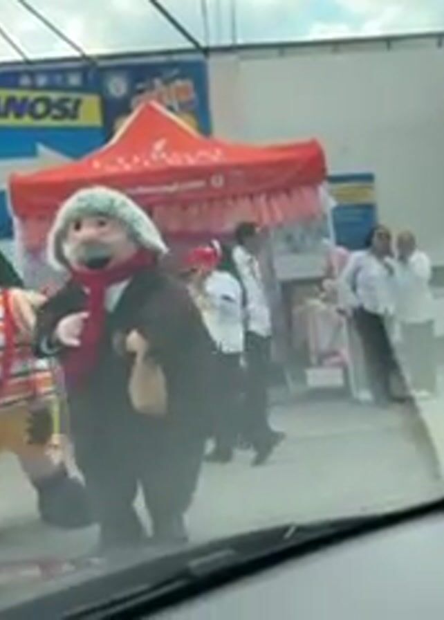 two people dressed as mascots outside a store. One mascot is wearing an outfit with a green hat, an orange and white striped shirt, and yellow shorts. The other is wearing a black suit and a grey wig. In the background, several people in white coats can be seen standing and walking around a red tent. A sign on the right side of the frame advertises a pharmacy and medical consultations. The video is shot from inside a car, with the dashboard visible in the foreground.