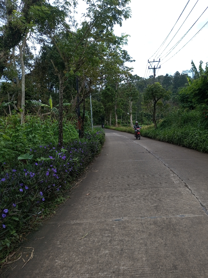 This image displays a paved, two-lane road in Ariyalai, Sri Lanka, curving gently to the left and receding into the distance. The road surface is concrete or asphalt, exhibiting visible cracks and expansion joints. Lush green vegetation and numerous trees line both sides of the road, forming a dense canopy in areas. On the immediate left, a thick growth of dark green plants featuring multiple small purple flowers parallels the roadside. A utility pole with multiple overhead power lines is present on the right side of the frame. One individual, wearing a light helmet and dark attire, is actively riding a red scooter towards the viewer on the right lane. A second person on a scooter is partially visible further down the road, moving away from the camera. The background consists of densely forested hills beneath an overcast sky.