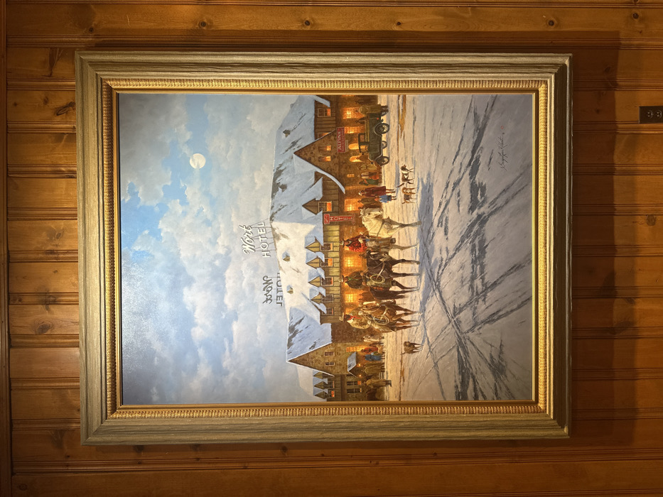 A framed painting hangs against a paneled wall. The artwork depicts a snow-covered scene at night, illuminated by a full moon. A horse-drawn carriage is arriving at a hotel; people and dogs gather around the entrance. The hotel bears the name "Word Hotel" and "Alpine". The scene evokes a sense of warmth and nostalgia. The frame is ornate, adding to the artwork's traditional and rustic aesthetic.
