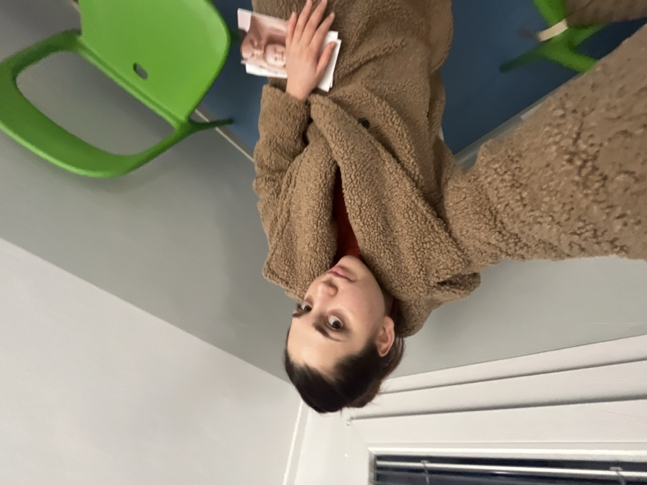A woman with dark hair pulled back and wearing a brown, plush coat sits in a room. She holds a printed photo, possibly of a baby, in her left hand. A bright green chair is partially visible beside her. The room has white walls and a window with blinds at the bottom of the frame. The image appears to be rotated, causing the perspective to be upside down. The woman looks toward the camera with a slight upward gaze.