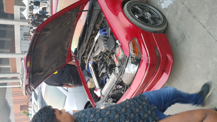 The scene depicts an outdoor vehicle gathering in Purbachal, Bangladesh. In the central and right foreground, a dark red sedan, exhibiting modifications consistent with a performance vehicle, is parked with its hood fully open. The visible engine bay features a modified air intake system with a polished metal pipe and a cone air filter, a silver strut bar with blue mounting brackets, and a visible automotive battery. The vehicle's front bumper lower lip shows minor scuff damage. It is equipped with black multi-spoke aftermarket wheels. To the left of the sedan, a male subject, dressed in a dark, patterned short-sleeved shirt and blue jeans, is partially visible from the chest down, facing right and observing the exposed engine bay. A second male subject, wearing a black short-sleeved shirt, is partially obscured behind the open hood of the red sedan. The background shows a paved area populated by numerous additional individuals, predominantly male and casually dressed, who are dispersed among other parked vehicles, including several white and silver sedans. A large, multi-story building with a light-colored facade and visible columns is present in the distant background, alongside a white tent structure on the far right. The ground surface is paved concrete or asphalt, displaying visible cracks. The lighting indicates an outdoor daytime setting.