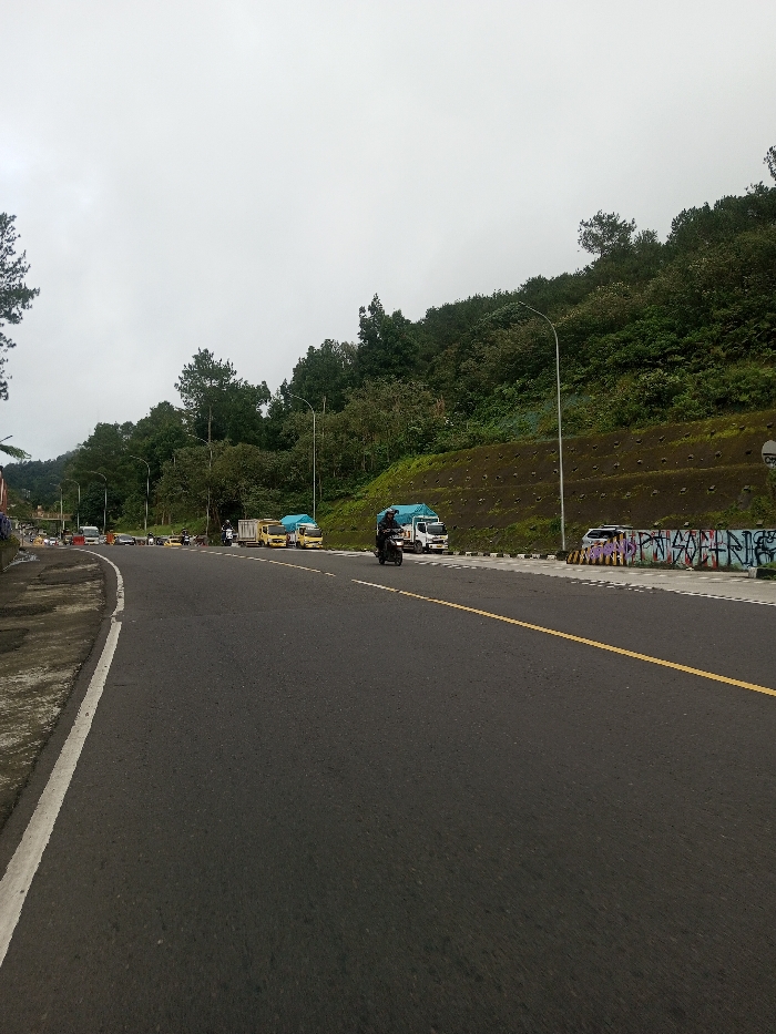 An overhead, overcast sky dominates a view of a highway in Sandamal Eliya, Sri Lanka. The dark asphalt road, marked by a broken yellow center line, curves gently to the left in the distance. A solid white line delineates the left shoulder, which features rough concrete and some puddles. On the right, a solid white line separates the main thoroughfare from a paved shoulder or parking area. A lone individual, dressed in dark attire and a helmet, operates a black motorcycle, moving away from the camera on the right side of the main road. Parked on the right shoulder are multiple vehicles: a white pickup truck with a blue tarp covering its bed, another white truck behind it, and several yellow trucks further along. Behind the parked vehicles, a dark green concrete retaining wall ascends, featuring visible anchor points or drainage holes. The lower section of this wall, near the foreground, is covered with multi-colored graffiti. Above the retaining wall, a dense, verdant hillside rises, thickly covered with trees and vegetation. Several tall, grey streetlights are positioned along the right side of the road. In the distance, other vehicles including a white van are visible on the curving road. The scene is illuminated by diffused, natural light, indicating an overcast day.