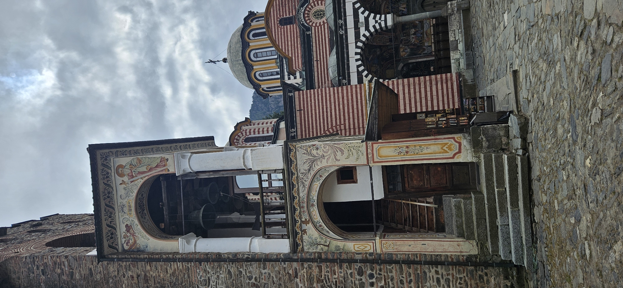 An exterior scene depicts a portion of the Rila Monastery complex in Rilski manastir, Bulgaria, under an overcast sky. The foreground features a cobblestone ground leading to a multi-structured building. To the left, a stone-built tower transitions into a painted section containing an arched entrance at ground level, accessed by five grey stone steps. This entrance is adorned with frescoes featuring floral patterns, abstract designs, and a small landscape depicting a tree and a bird; a dark wooden door is set within. Above this, a bell tower section with two white columns supports a balcony with a wooden railing. Several dark-colored bells hang within the arched opening of the bell tower, which is decorated with frescoes, including a robed figure holding a staff on the right side of the arch. To the right, a significant portion of the monastery's main church is visible, characterized by prominent horizontal red and white striped brickwork on its walls. Below these walls, a black and white striped arched portico with frescoed interior walls and supporting columns is partially visible. The church features multiple domes, with the largest one centrally located, displaying a grey-green top, a yellow and black striped drum, and a dark cross on its apex. Behind the monastery structures, dark green, forested mountain slopes rise into the cloudy background. A small, dark wooden kiosk or stall displaying various items, possibly religious icons or books, stands to the right of the stone steps, beneath a small wooden canopy. No people are present in the scene.