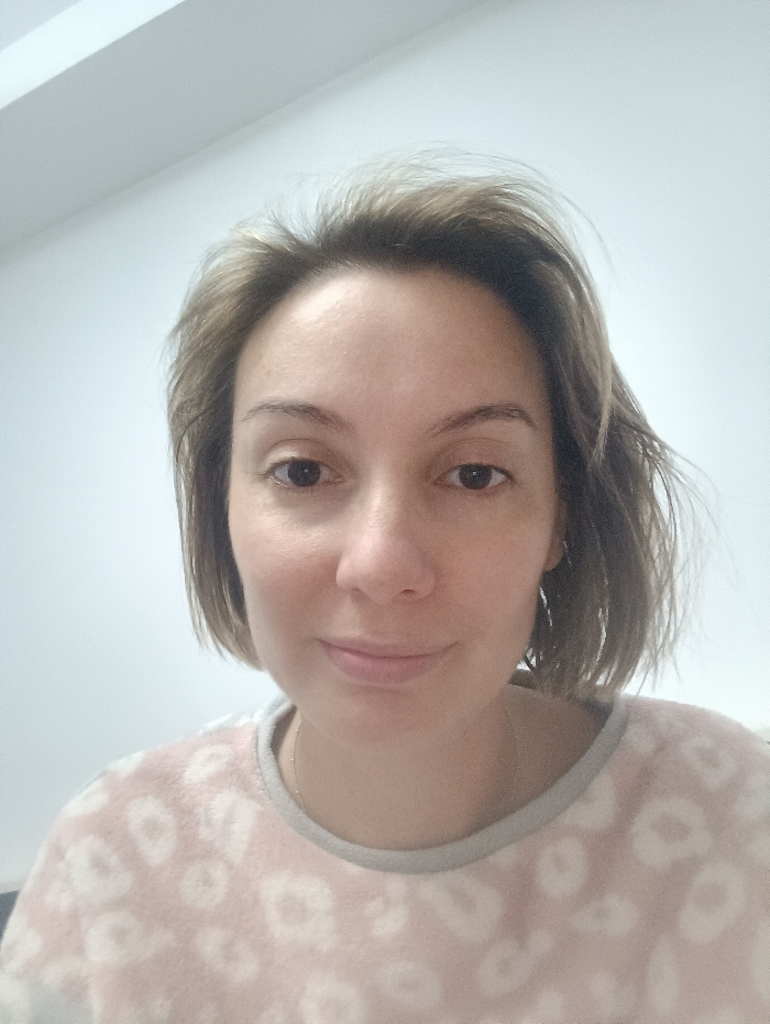 A light-skinned woman with brown eyes and blonde hair smiles directly at the camera