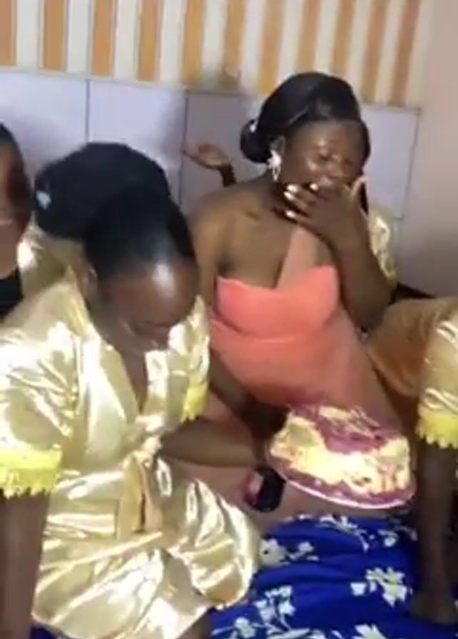Four women are on a bed holding a cake. The woman in the center is wearing a pink strapless dress with her hair in an updo. She is looking at the cake and has an earring that is visible. The other three women are wearing matching gold satin robes. They also have their hair up. The cake is white with what looks like purple or red frosting. The bed has a blue comforter with a white pattern. The walls are white with a strip of light brown and white stripes.
