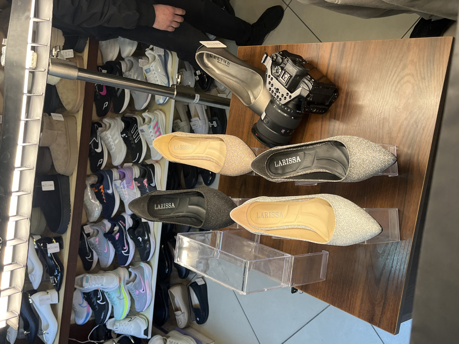 The image depicts an interior view of a shoe store or retail space located in Al-Midan Municipality, Syria. The scene is dominated by a display counter made of polished dark wood in the foreground. On this counter, five women's shoes are prominently displayed: two pairs of "LARISSA" branded pointed-toe glitter pumps/flats (one pair in dark grey/black glitter, another in light gold/champagne glitter), each positioned on a clear acrylic display stand. A single silver pointed-toe pump is also visible, placed directly on the table. Adjacent to these shoes, a black digital camera with a large lens is resting on the counter. A clear, multi-tiered acrylic display stand is positioned on the left side of the table. In the background, multiple shelves are densely packed with a variety of footwear, including numerous athletic shoes from brands such as Nike and Adidas, as well as casual boots, flats, and other women's shoes. Many items have visible price tags or labels. A horizontal fluorescent light fixture illuminates the shelves from above. The lower portion of a person, wearing black pants and black shoes, is visible on the right side of the frame, standing next to the display counter. The floor is tiled with light-colored squares.
