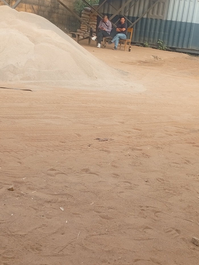 Two men are sitting outside a corrugated metal building near a large pile of sand