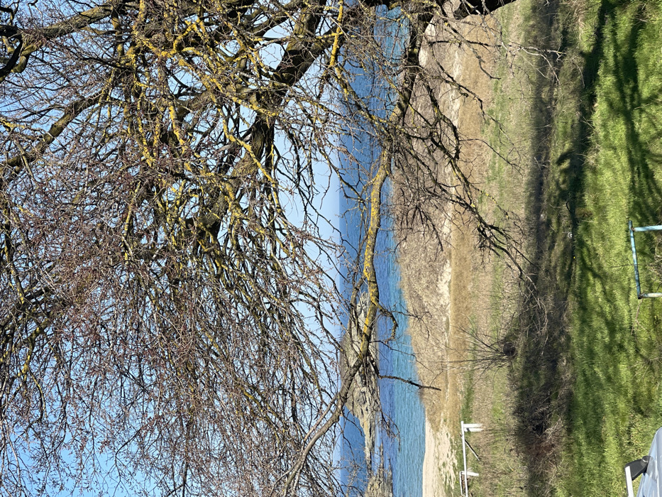 The image presents a coastal scene in Lozenets, Bulgaria, under a clear blue sky. A large, deciduous tree with numerous bare, gnarled branches, many of which are covered in yellow lichen and bear small reddish buds, occupies the foreground and midground, framing the view. The tree casts distinct shadows across a verdant green grassy area in the immediate foreground. Beyond this grass, a field of dry, yellowish-brown vegetation transitions into undulating sandy dunes, which meet a light-colored sandy beach. The background features the calm sea, exhibiting clear turquoise hues near the shoreline and deeper blue further out. Several dark, rocky formations or islets are visible offshore, particularly a prominent rock mass situated to the left. Objects of interest include a silver-colored edge of a vehicle in the bottom-left corner, two white, rectangular structures on the ground near the beach on the left, and a light blue metal frame in the bottom-center. No individuals or specific activities are observed.