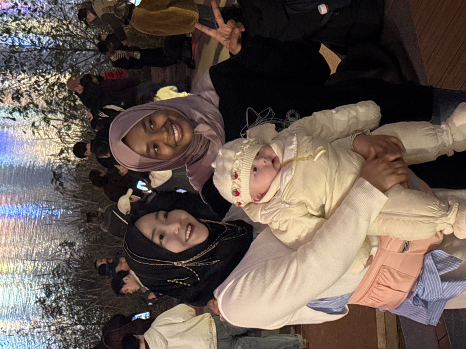 The scene is set outdoors at night in 江北城街道, China, featuring three individuals prominently in the foreground against a backdrop of a crowd and an illuminated body of water. On the left, a woman of East Asian appearance wears a black hijab adorned with golden decorative chains and a white long-sleeved top over a blue and white striped shirt, with a pink hip-seat carrier visible around her waist. She smiles, looking off-camera to the left, and holds an infant. The infant, positioned centrally, is dressed in a cream-colored padded snowsuit and a matching knitted hat embellished with small red berry-like details, and faces the camera with a neutral expression. To the right, a woman of African appearance wears a light purple hijab and a dark long-sleeved top with a subtle light-colored graphic. She smiles, looking towards the camera, and raises her right hand to form a peace sign. Both women have hands near the infant. In the blurred mid-ground, a dense crowd of people, many holding up illuminated smartphones, is visible along what appears to be a waterfront. Behind them, a body of water reflects numerous bright, colorful artificial lights in hues of blue, purple, red, and white, with dark foliage visible along the immediate bank.