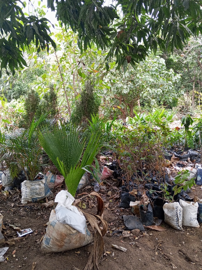 The image displays an outdoor plant cultivation site in Adankolo, Nigeria. The foreground presents a young palm-like plant with prominent green fronds, potted in a repurposed light-colored woven sack. Surrounding it are numerous other plants, varying in species and size, contained within similar white or off-white polypropylene bags and black plastic nursery bags. Visible markings on some woven bags indicate a former use. The ground is a mix of exposed dirt, dry foliage, and minor refuse including a clear plastic bottle. In the mid-ground, multiple slender, conical evergreen plants stand amidst a dense collection of smaller shrubs and saplings. The background is characterized by a thick canopy of broadleaf trees and general lush green vegetation. No individuals, actions, or specific interactions are visible.