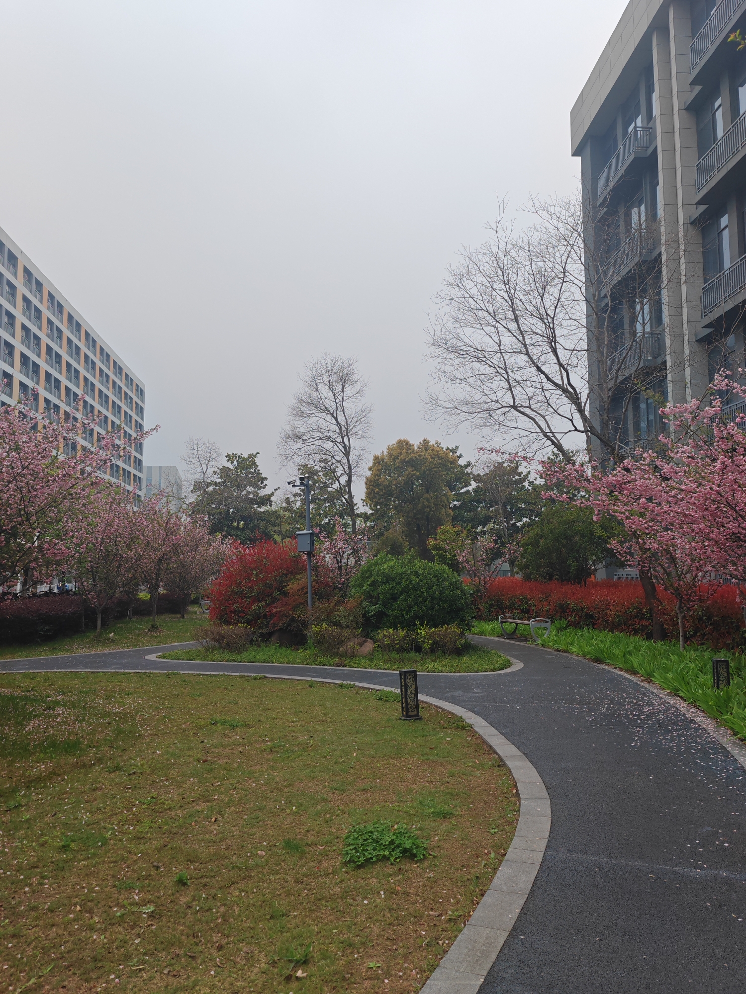 park scene in Jiangning District, China. The sky is overcast. On the left, a tall apartment building with multiple windows and balconies is visible. To the right, another similar building is present, partially obscured by trees. A curved asphalt pathway winds through the park. The pathway is edged with gray stone. The grass on either side of the pathway is interspersed with brown patches. Cherry blossom trees with pink flowers are in bloom on either side of the pathway. Other trees and shrubs, some with red foliage, are also present. A small bench is visible further along the pathway. Two decorative lamp posts are located along the path. The ground is covered in fallen petals. No people are visible in the image.